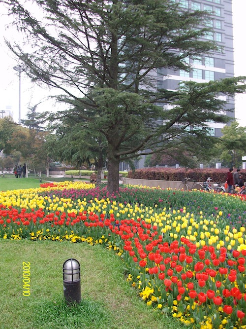 この日はこの道を朝とお昼に通っていて、チューリップの二番目の写真は朝です。