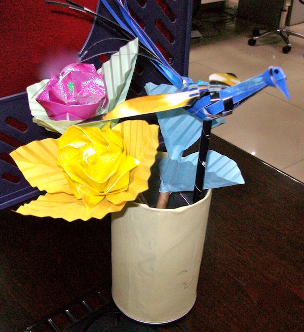 その彼女が研修最終日の朝、とことこと私の机にやって来て、片言の日本語で、「ありがとうございました」といい、紙で作った花と鳥の、彼女手作りのオブジェをプレゼントしてくれた。