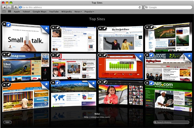 ところがこのsafari標準装備のTop Siteという機能(下の写真はサンプル画像)で見ると、表示されなかったはずのサイトが更新された状態で表示されているではありませんか