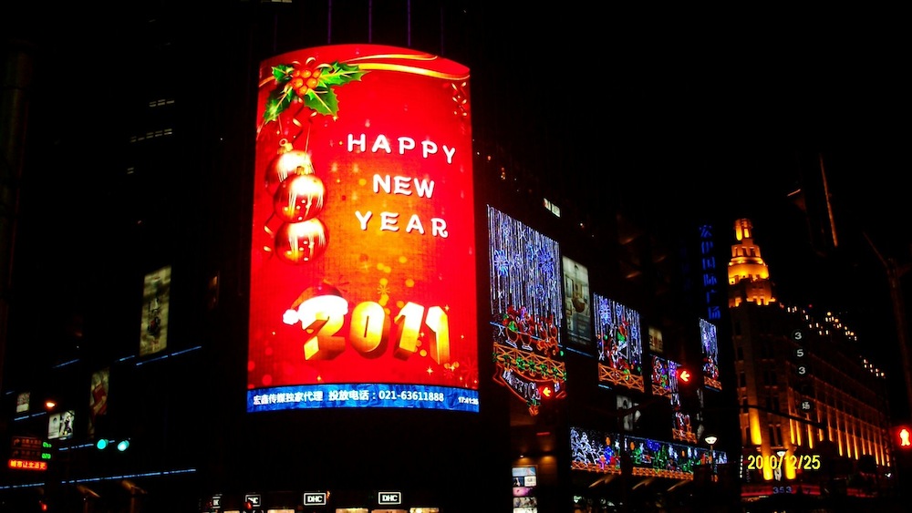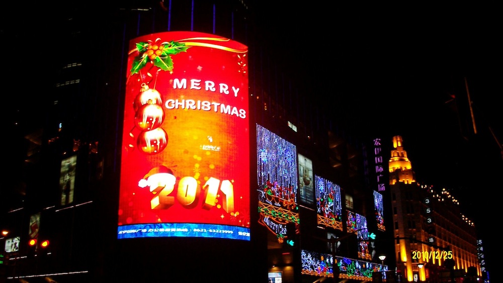 上海タワーもピロピロ光ってますし、ビルの側面全体が巨大ディスプレイになっている感じで、動画が映し出されてました。