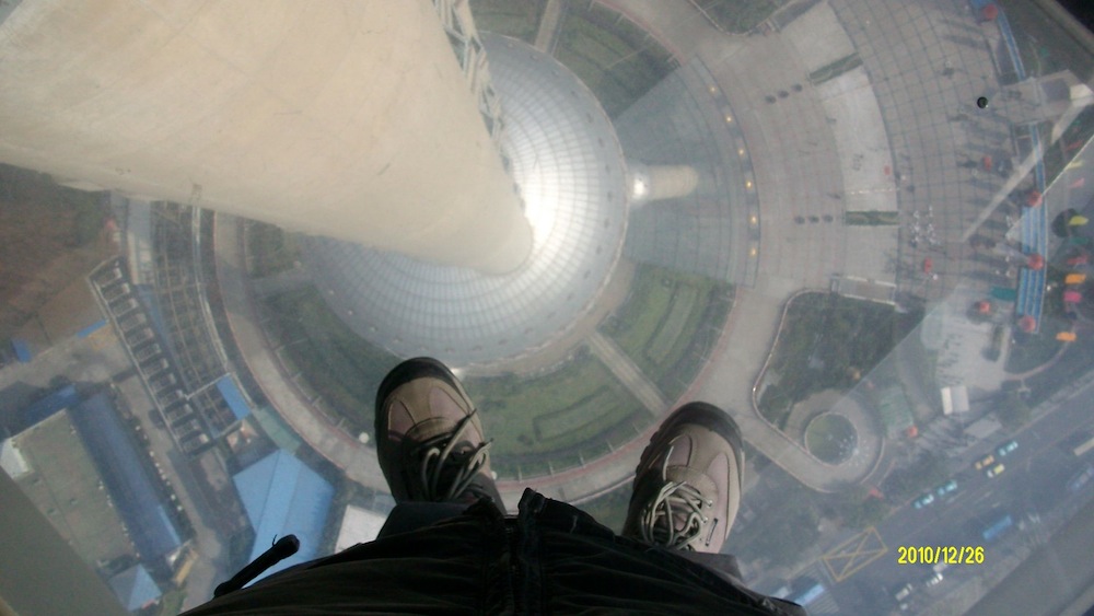 この塔、高さ260m付近にある球体の部分に、床がガラス張りのフロアというかベランダというか、そんなのがあります。外壁もガラスなんですが、上が30cmほど開いているので、強風も吹いております。