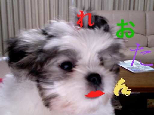 上の写真、日本の家で飼っている犬の「レオ」の写真に、下の娘が落書きして送って来たものです。